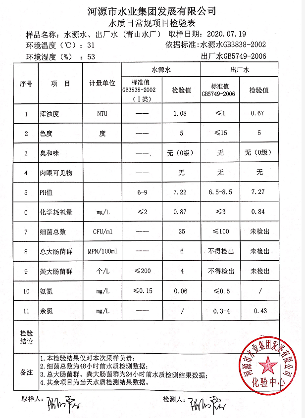 2020年7月19日水質檢驗報告