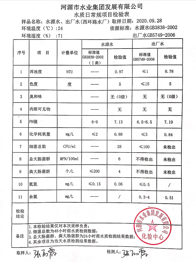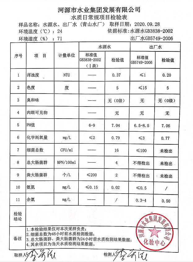 2020年9月28日水質檢驗報告