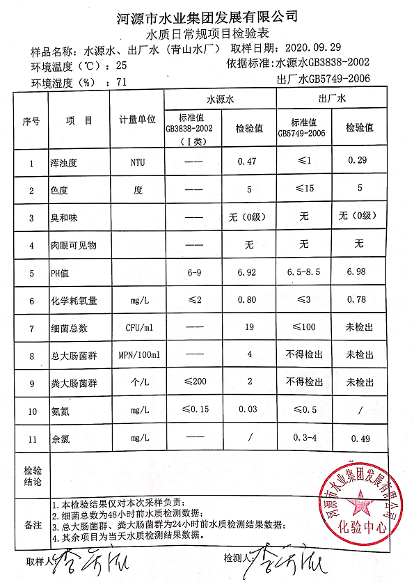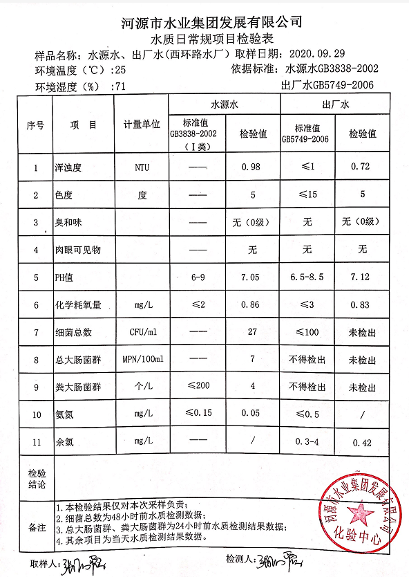 2020年9月29日水質檢驗報告