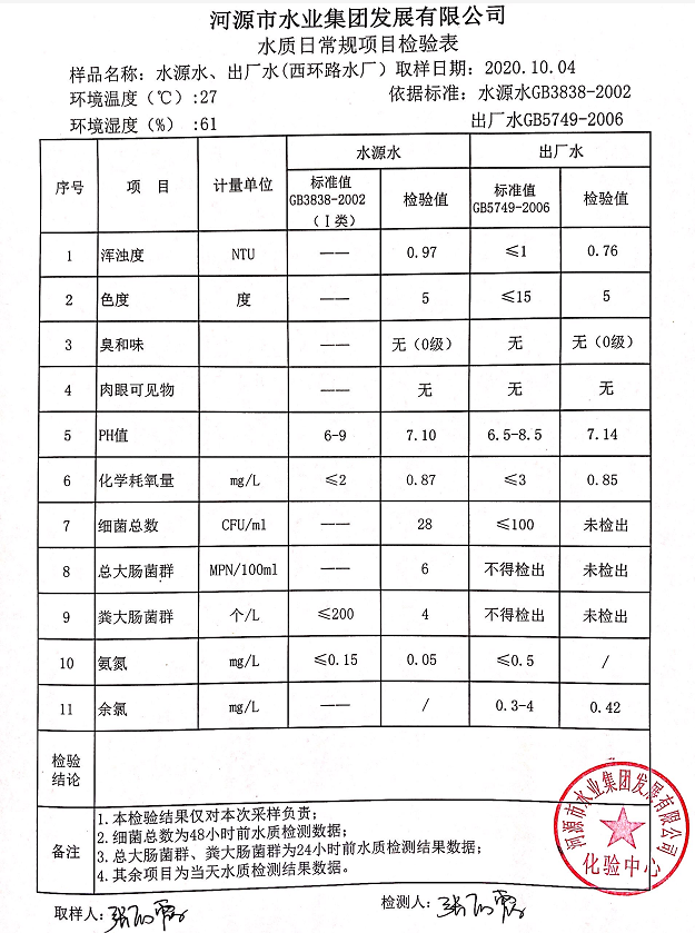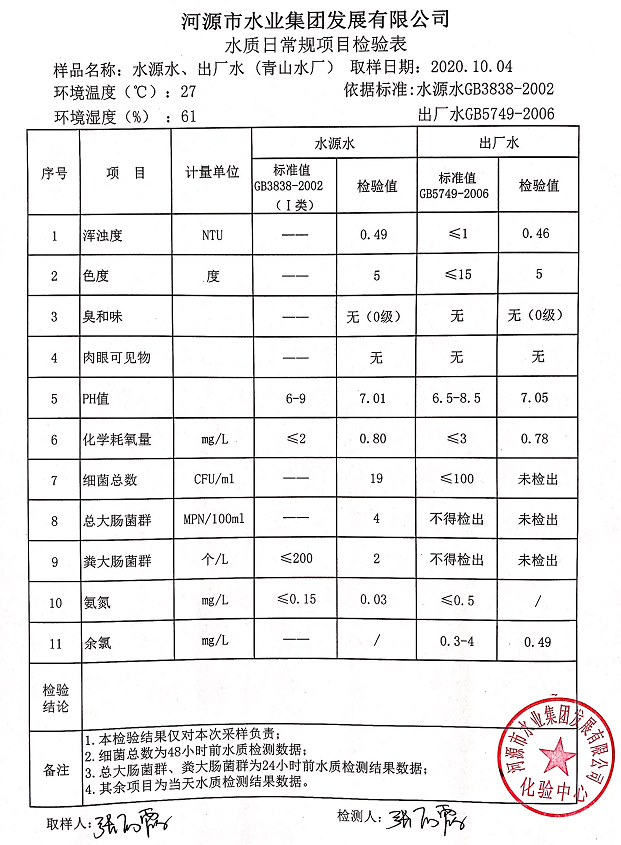 2020年10月4日水質檢驗報告