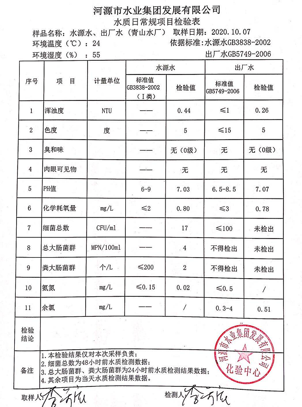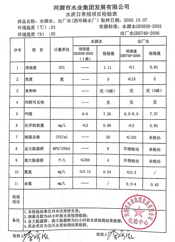 2020年10月7日水質檢驗報告