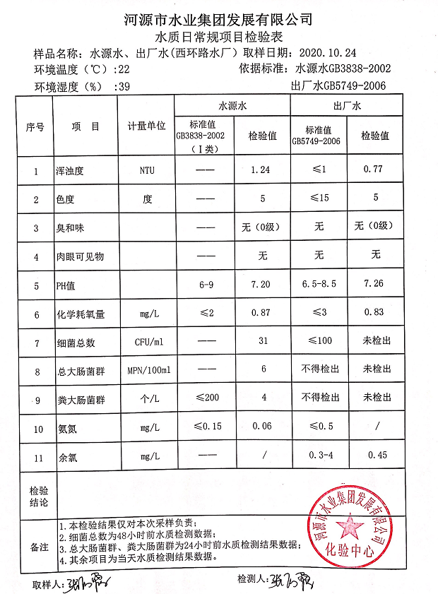2020年10月24日水質檢驗報告