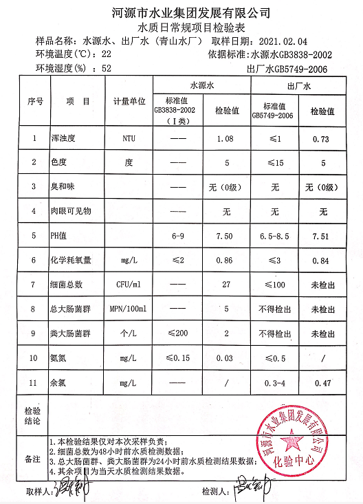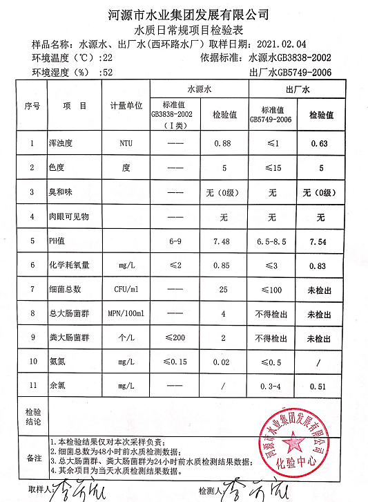 2021年2月4日水質檢驗報告
