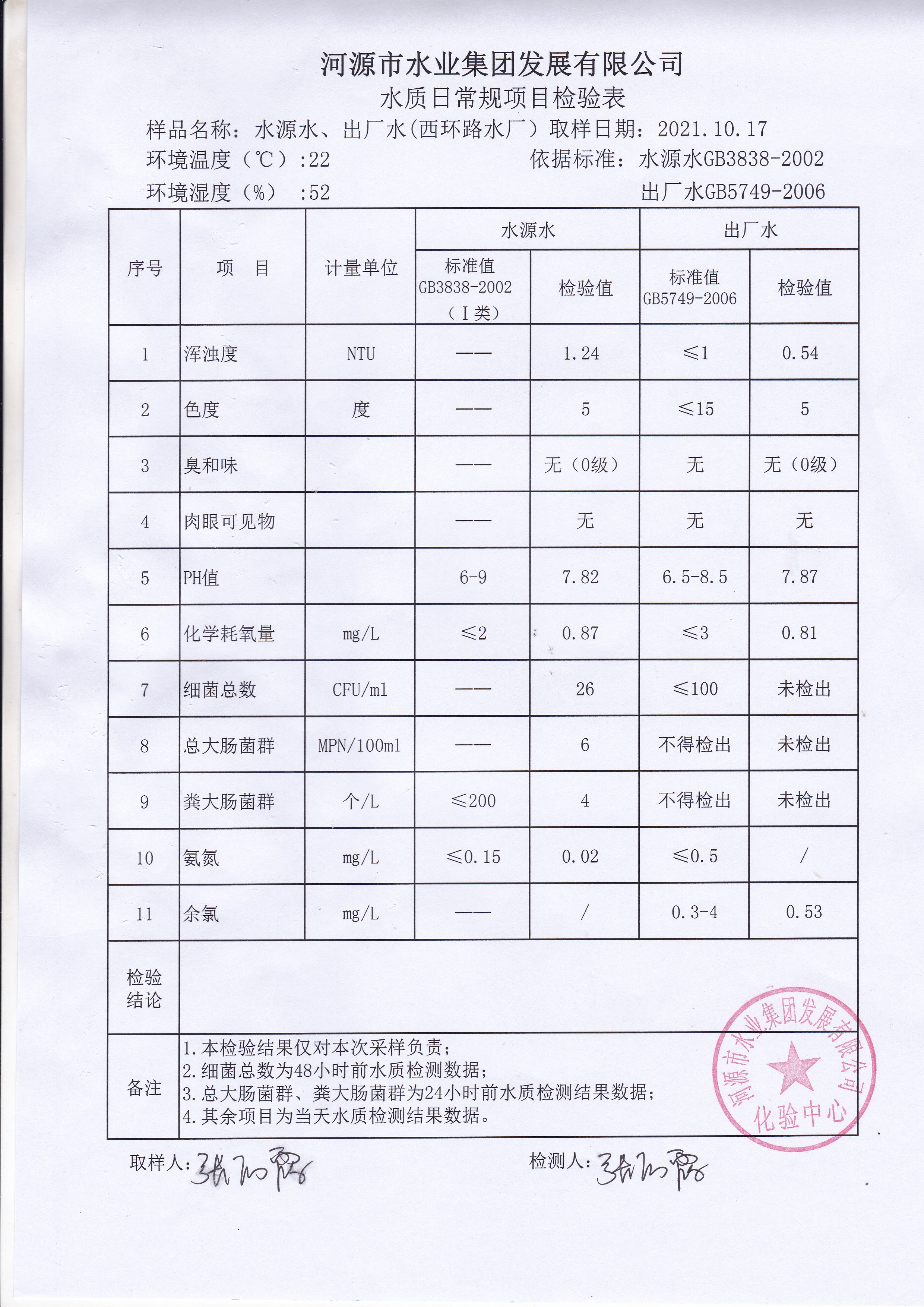 2021年10月17日水質檢驗報告