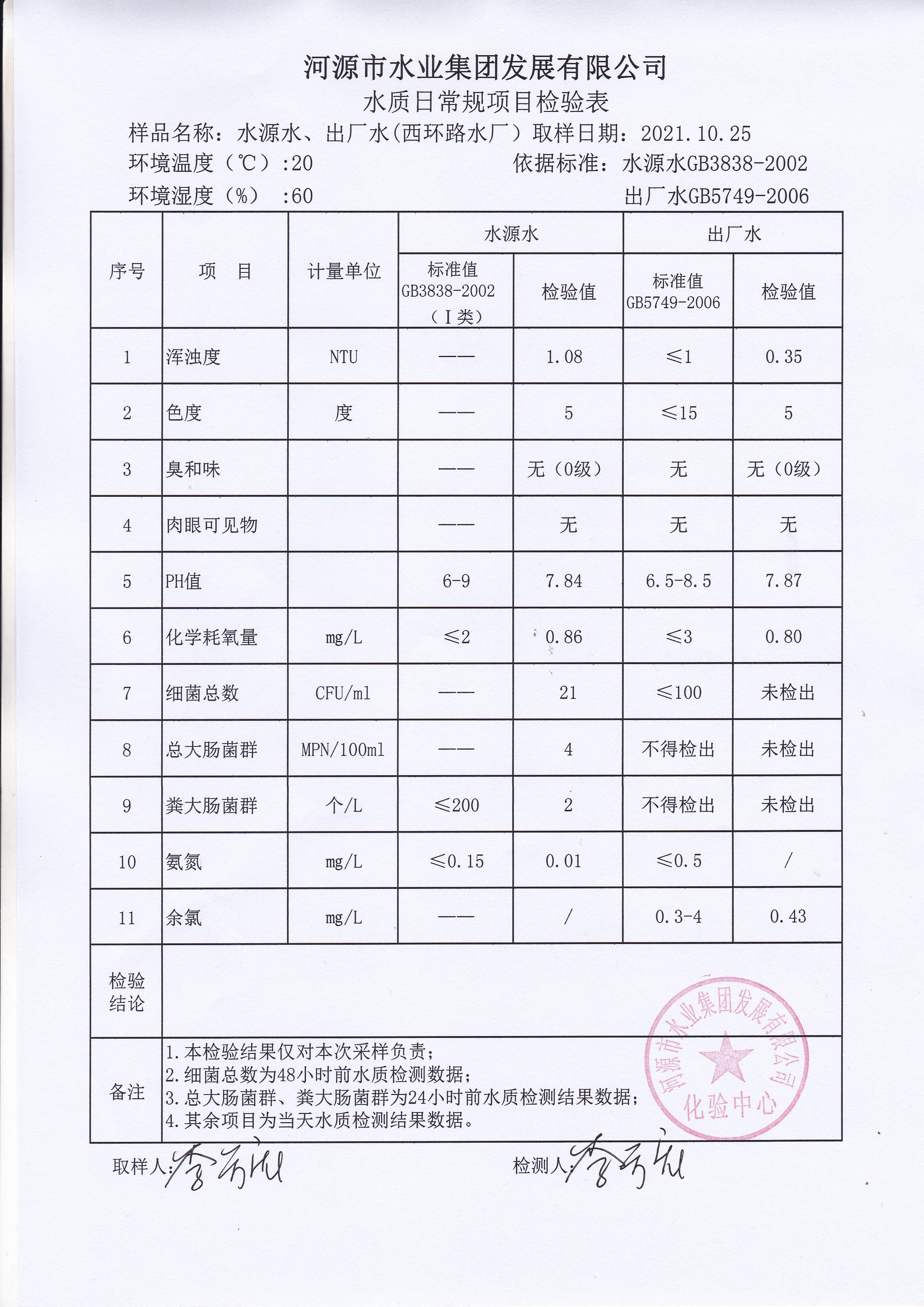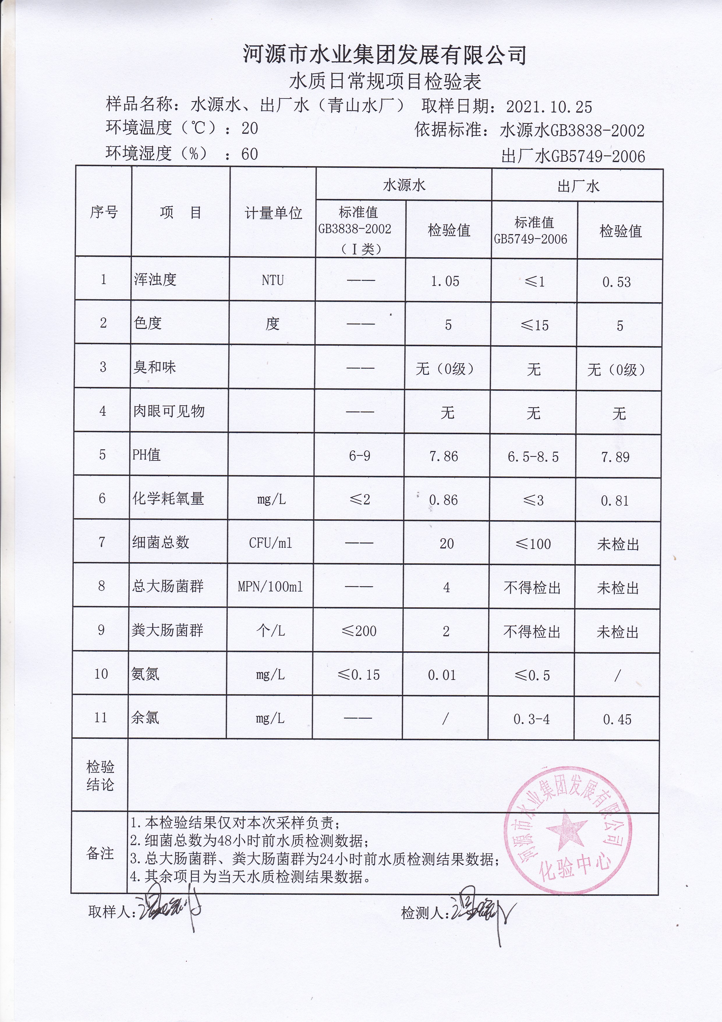 2021年10月25日水質檢驗報告