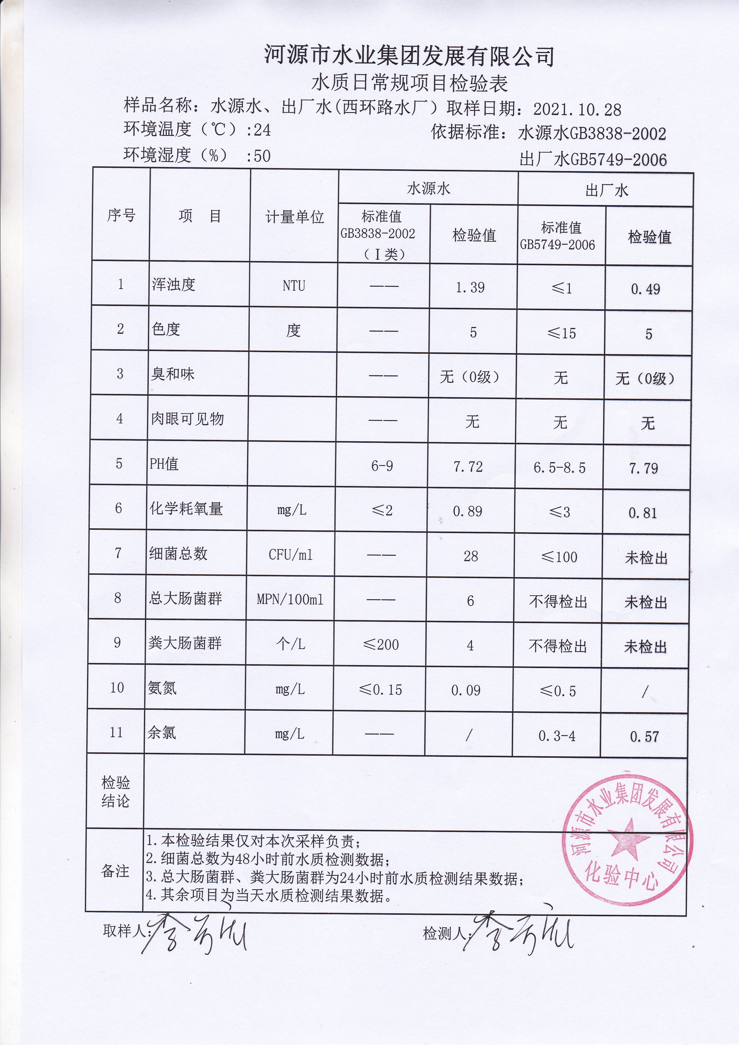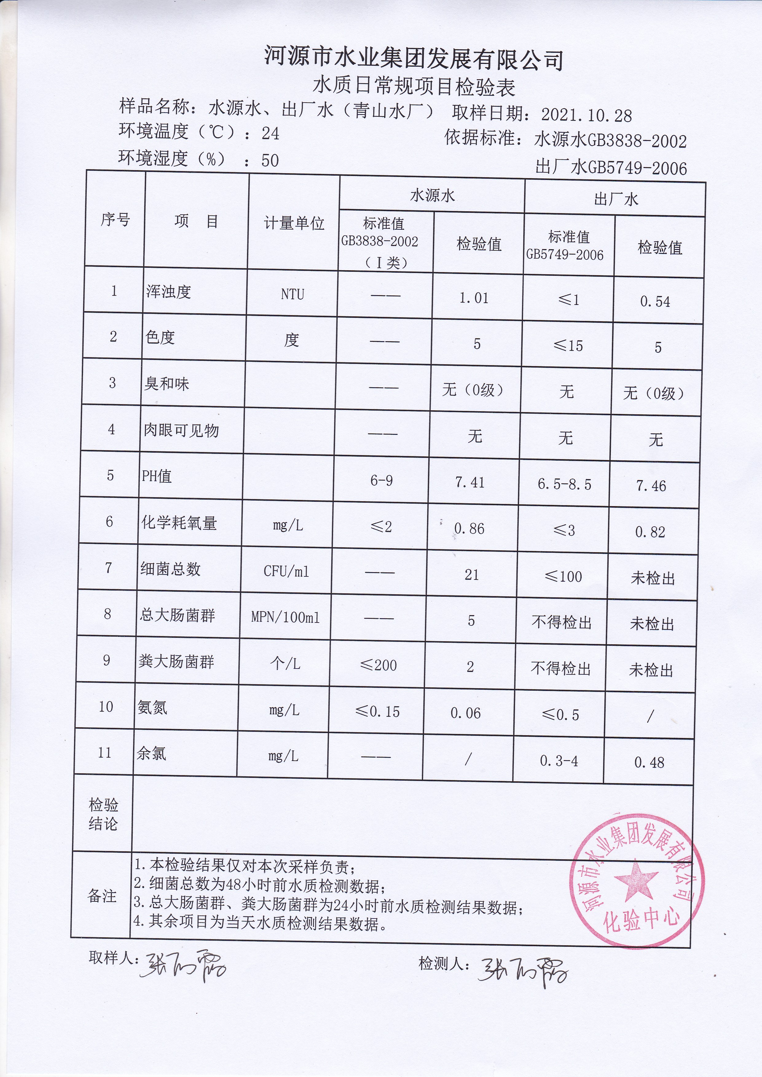 2021年10月28日水質檢驗報告